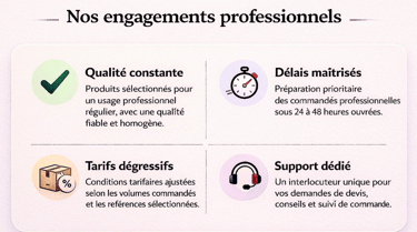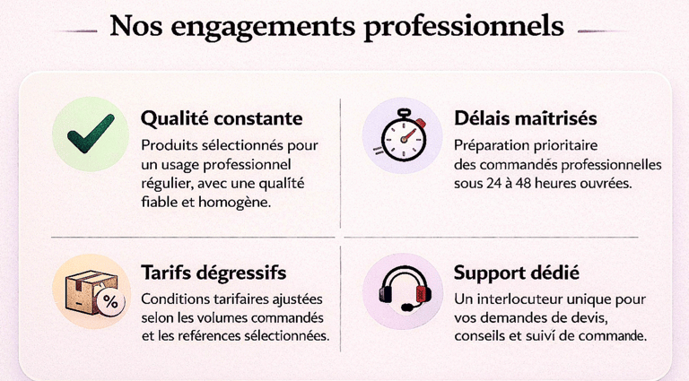 Préparation prioritaire des commandes professionnelles, généralement sous 24 à 48 heures ouvrées (hors périodes de forte activité).Support dédié